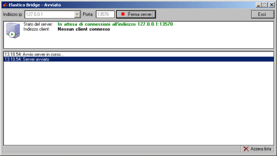 Il comando BRIDGE_CMD_SERVER_INFO può essere utilizzato per ottenere informazioni sul server. Il server risponde a questo comando inviando un pacchetto di un byte che può valere 0x00 se le informazioni sono disponibile e stanno per essere inviate, oppure 0xFF se si è verificato un errore. In questo caso il server invierà un ulteriore pacchetto con il codice e la descrizione dell'errore separati da una virgola. In caso di successo le informazioni saranno inviate in pacchetti separati.Attualmente le informazioni inviate dal server sono: - Versione del server di Elastico Bridge nel formato xx.yy.zz